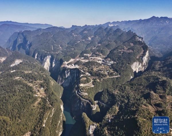 ↑11月30日拍摄的湖北省鹤峰县容美镇屏山村屏山峡谷全景(无人机照片)。