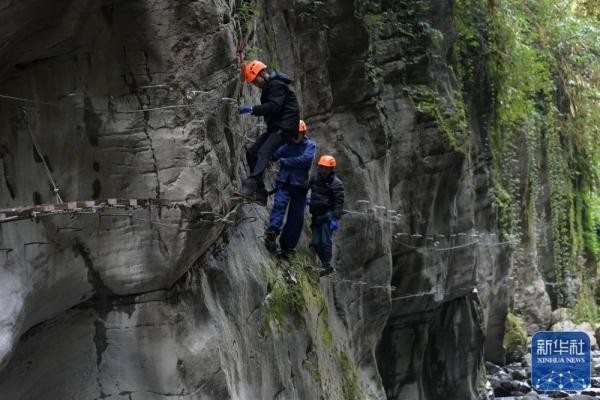 ↑11月30日,游客在湖北省鹤峰县容美镇屏山村屏山峡谷攀岩。