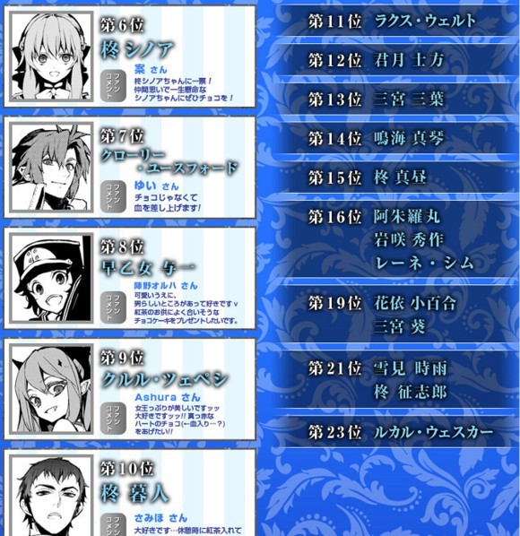 人气动画作品《终结的炽天使》官方在近日举办了有关白色情人节人气投票活动,而有关最终的票选结果也在近日有所公开,一起来看看结果如何吧。