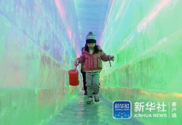 ↑1月18日,小朋友行走在龙庆峡冰灯艺术节冰灯展区的冰雕中。