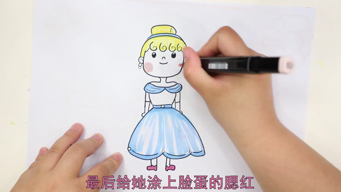 ②来涂上颜色,头发涂上黄色,裙子画上蓝色,选择喜欢的颜色涂上鞋子,最后涂上腮红。