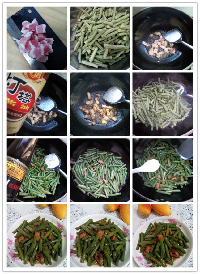 材料:猪肉100克,豆角1把,油适量,盐适量,红烧汁1勺,酱油适量。