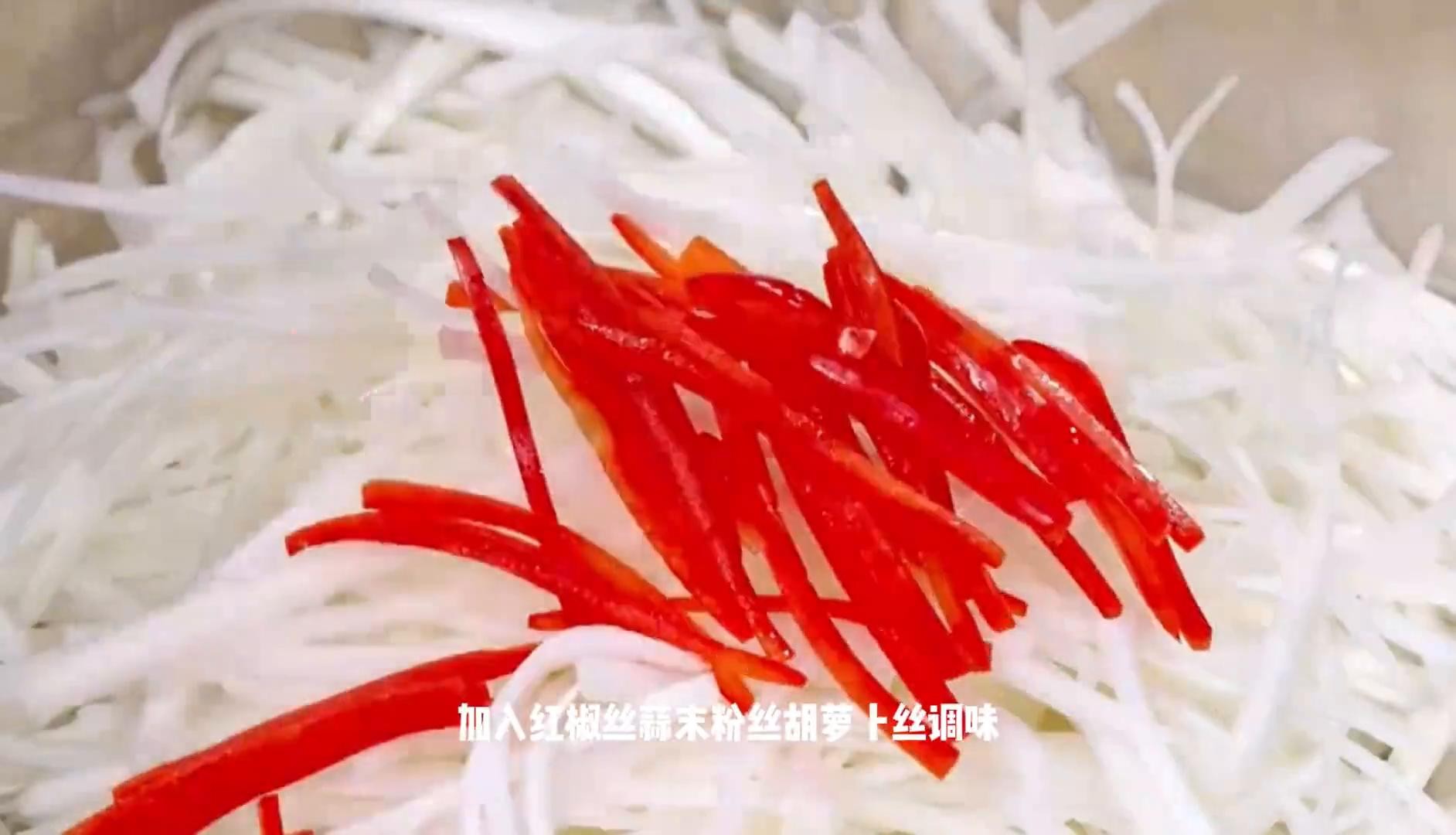 ·把白菜沥干水分后,加入红椒丝、蒜末、粉丝、胡萝卜丝。