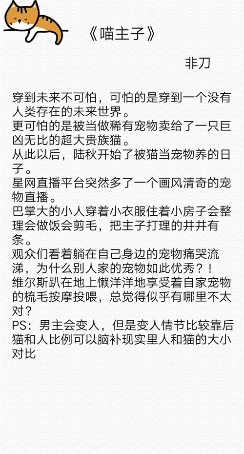 今天找到一本小说,女主角穿到动物是主人的世界,男主是一只巨大的猫,目测很有趣,所以今天就来盘点几本主角是猫猫的完结文,感受猫主子的威力吧!