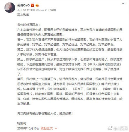 莉哥回应直播间唱国歌被封杀事件道歉原文完整内容