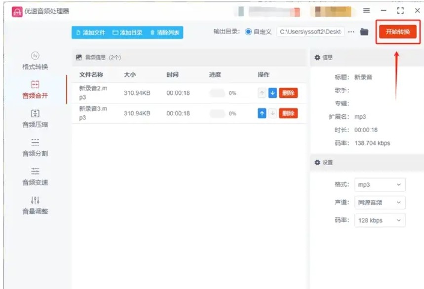 开始转换:点击软件界面右上角的“开始转换”按钮,软件将开始合并音频。