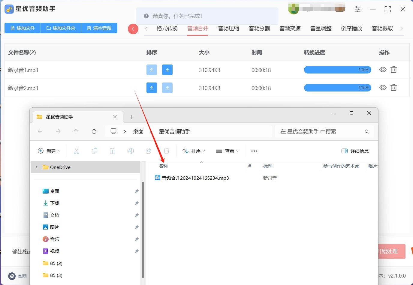 查看结果:合并完成后,软件会自动打开输出目录,可以在这里找到合并后的MP3文件。
