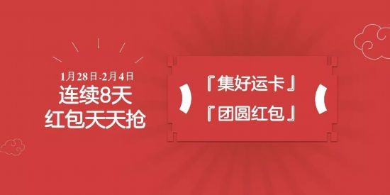 其中,集好运卡、团圆红包两个主题活动从1月28日小年开始,一直持续到2月4日除夕。