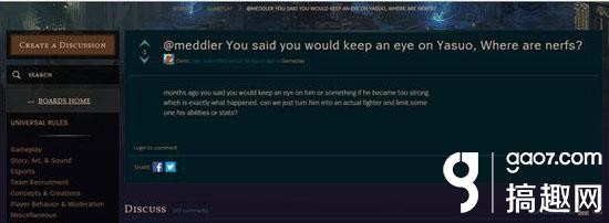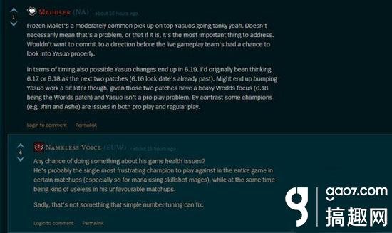 Meddler在论坛中表示,现在亚索是有点强有点不平衡,但是在进行修改之前,他们要先确认是不是因为坦克装备导致了亚索的过强。比如,现在冰锤作为亚索的常见出装的确让亚索更肉了,但显然这不是个问题。拳头不会在测试小组观察亚索具体问题之前给出亚索的改动方向。