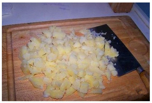 3.把水倒掉。土豆切成2cm左右的小块。