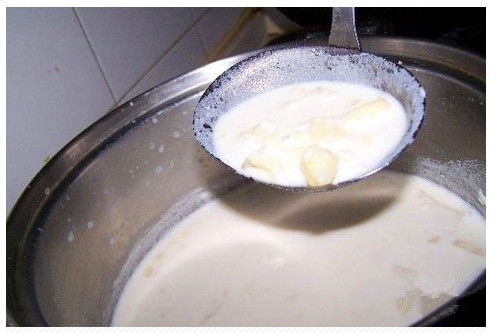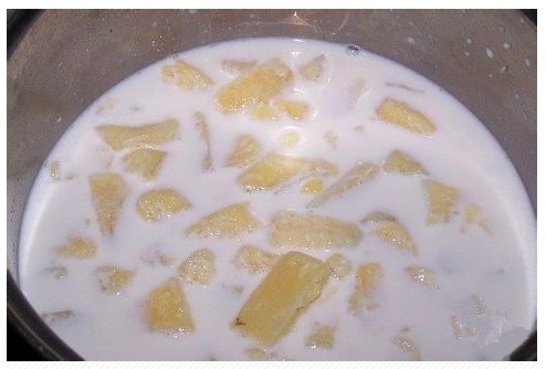 4.把切好的土豆放入锅内,倒入牛奶