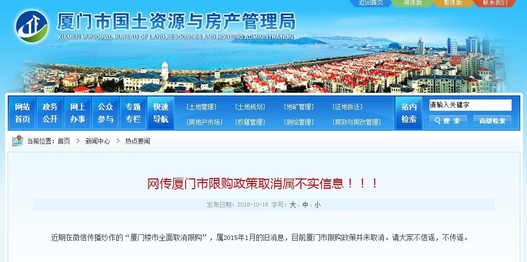 官方辟谣!网传厦门市限购政策取消属不实信息!
