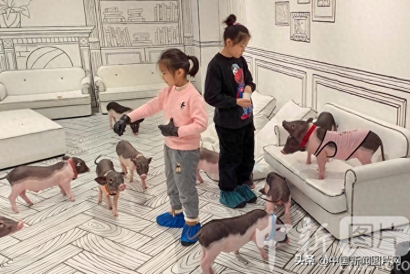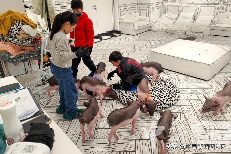 2023年2月11日,上海虹口区一商场内,几位孩子在一家宠物店内和十几只小香猪玩耍,吸引众多顾客在店前好奇围观。