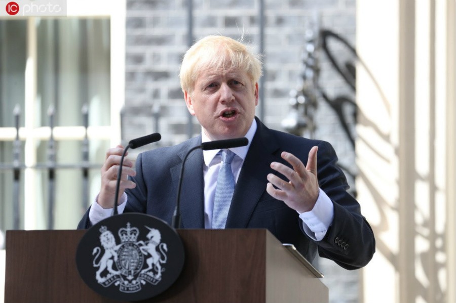 约翰逊从白金汉宫回到唐宁街十号后,在首相府门前发表就职演讲。