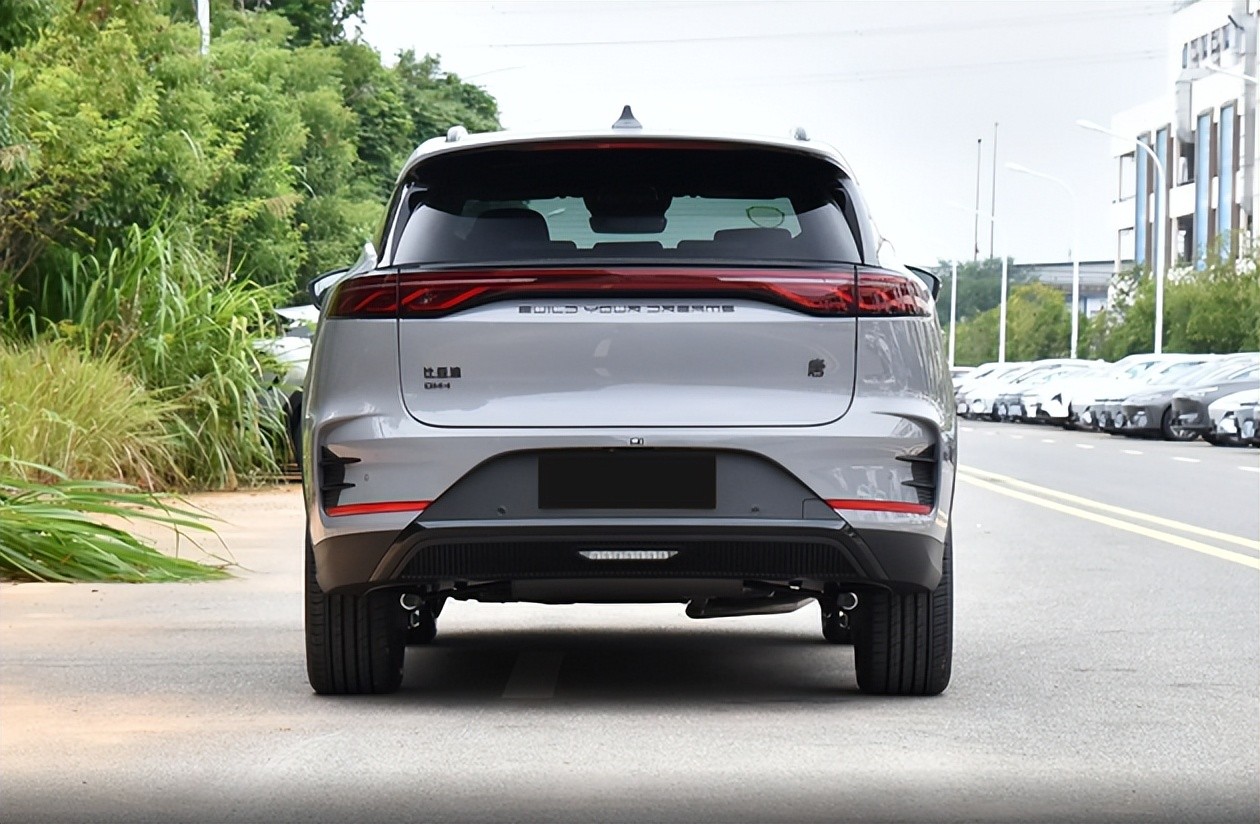 来到车尾,贯穿式的中国结尾灯设计无疑是最大的亮点。两侧的尾灯组融入了中国结的元素,点亮后璀璨夺目,极具辨识度,同时也寓意着吉祥如意 。流水式转向灯的加入,不仅提升了车辆的科技感,还为行车安全提供了更好的保障 。底部大面积的熏黑后包围内置扩散器,两侧的 “C” 形导风槽内加入了熏黑风刀装饰,再配上大尺寸的尾翼,将运动氛围烘托到了极致 。唐 Dm-i 智驾版的外观设计,无论是整体造型还是细节之处,都展现出了比亚迪对美学的深刻理解和精湛工艺,让人过目难忘 。