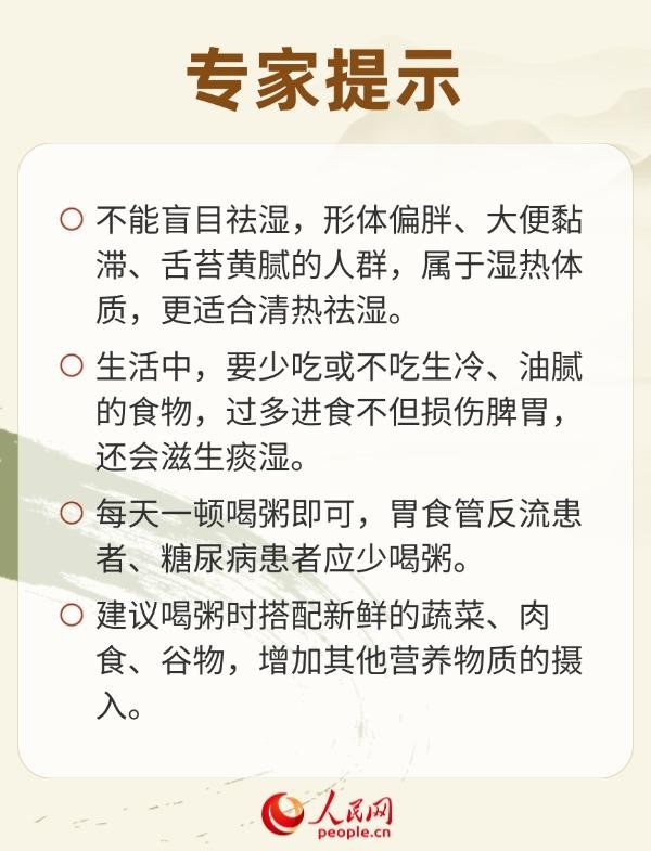 在雨水节气,湿气盛行,不少人会出现食欲不振、消化不良、腹泻等症状,这时候健康保健的重点是在健脾祛湿。江苏省中医院消化(脾胃病)科主任中医师朱磊在接受采访时表示,雨水时节,可通过食用以下几款养生粥使脾胃功能强健,从而改善因水湿困脾导致的系列不适症状。