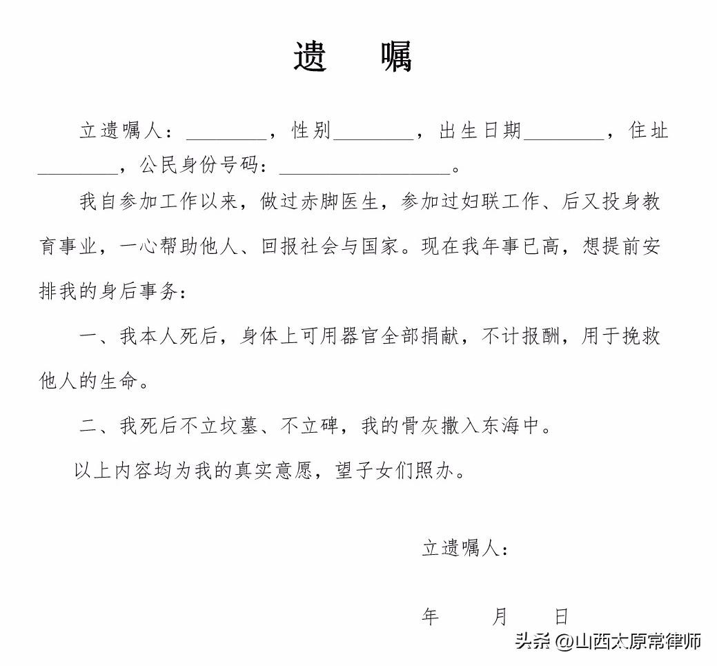 格式规范:自书遗嘱全文应由遗嘱人亲笔书写,签名,注明年、月、日。