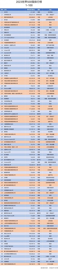 在 《财富》发布的2023年世界500强企业排行榜中,沃尔玛连续第十年排第一,沙特阿美首次上升至第二位,中国的国家电网公司继续位列第三,亚马逊第4位,中国石油排第5位,京东第52位,阿里巴巴第68位,华为排第111位,腾讯147位,比亚迪212位。
