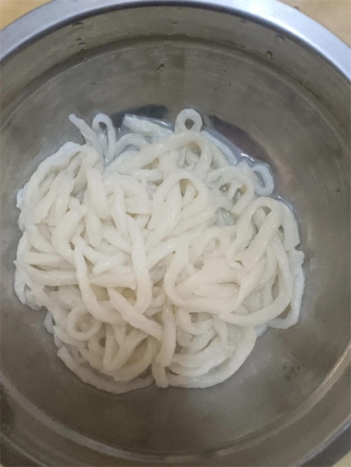 量大的可以分开几次。然后,用买的剔尖面不锈钢筷子,细细的,薄薄的,直接拨到开水锅里,开2-3开后,捞出。光滑细腻,可口,麦香味浓厚(见图一图二图四图五)。再做上自己爱吃的特色卤汤(图一图四)。制作十分便利,便宜,简单,随吃随做。