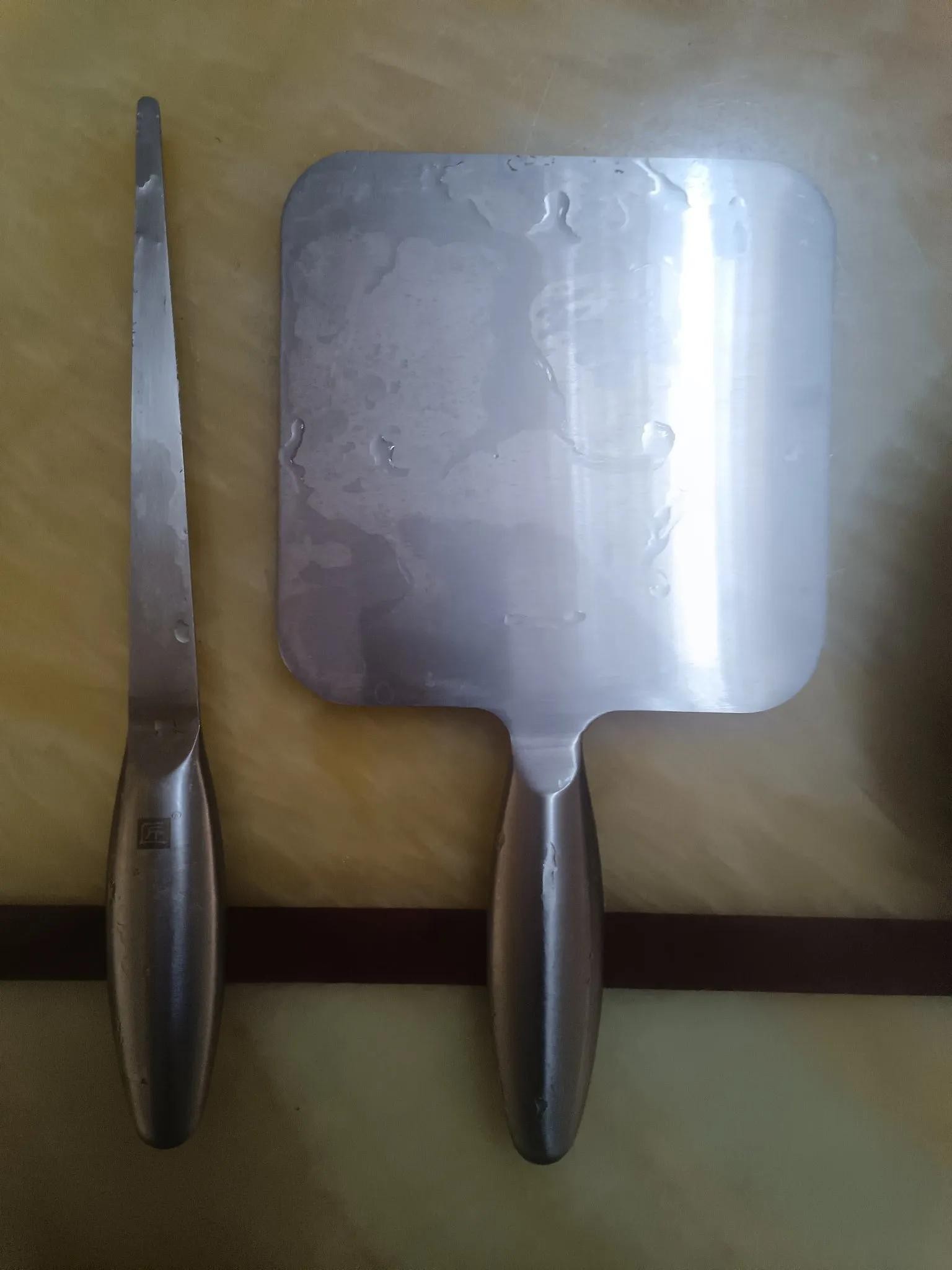 山西剔尖面做法:根据饭量,抓2-4把白面,用筷子搅拌成软一点的面团,最好醒面5-10分钟。买一个山西剔尖面专用工具(见图三),很便宜。面醒好后,放在剔尖面不锈钢板上,用手薄薄铺满铺平 。