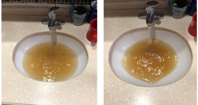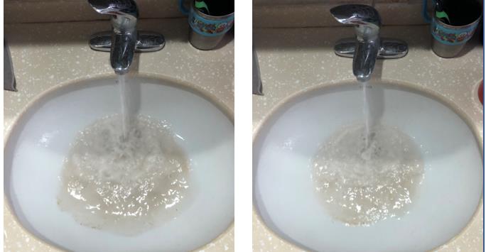 上图为入住7年后热水管清洗效果,从图中可以明显看出:污水成混浊状,主要是由于柠檬酸水溶液溶解堆积的水垢后产生。下图为冷水管清洗效果,管中明显有有泥沙等附着物,所以污水呈黄褐色。