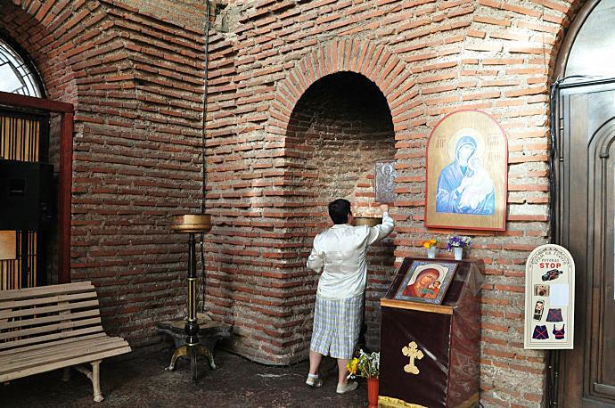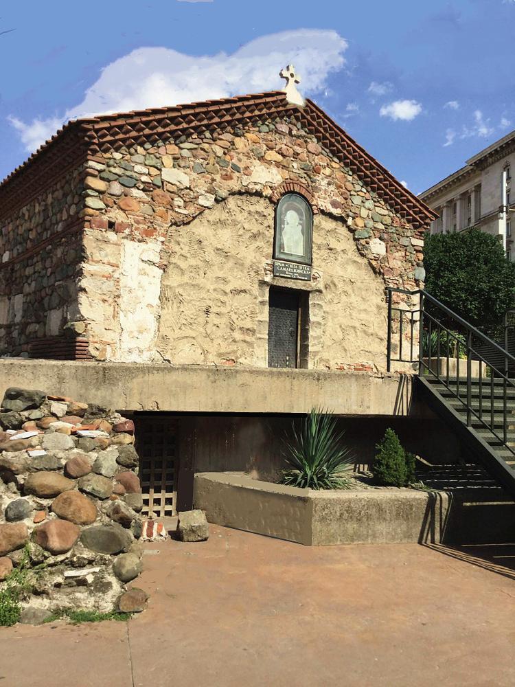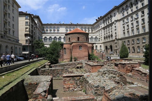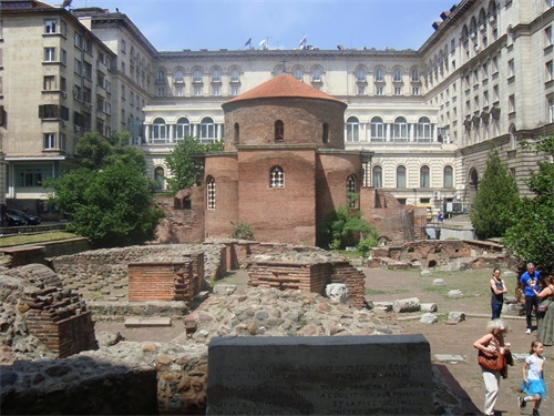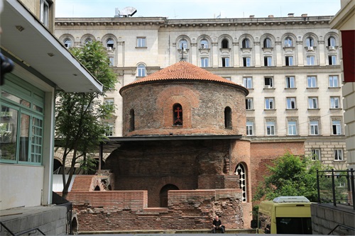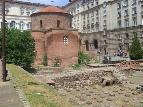 在总统府和喜来登饭店的内院有一个“圆形建筑”,这是建于4世纪的“圣格奥尔基”(St.George)教堂遗迹和古罗马时期的建筑遗址。这座早期基督教红砖圆形教堂,是巴尔干地区保留年代最为久远,整体结构保存最为完整的教堂。教堂左边是喜来登酒店,右边是总统府大楼。