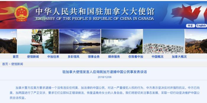 【孟晚舟被捕】北京时间12月6日早间,中国驻加拿大大使馆发言人应询就加方逮捕中国公民事发表谈话: