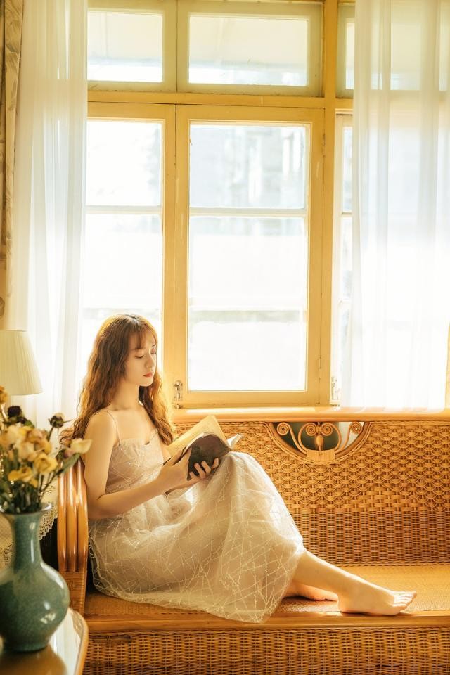 坐在沙发上,手翻开一本书,一只脚弯曲,一只脚伸直,呈现凸起的状态,这个拍照姿势,动作简单好看,既可以拍出文静的感觉,又可以显得腿长。