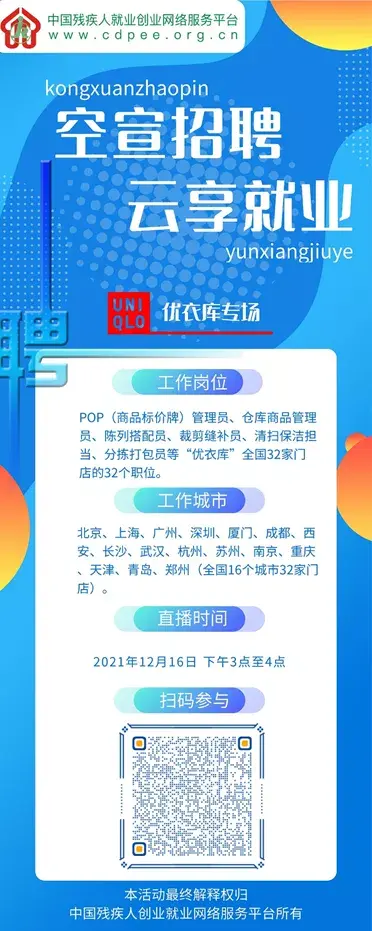 “空宣招聘,云享就业”首期企业为“迅销(中国)商贸有限公司(优衣库)”。该企业在我国北京、上海、广州等多个城市共有800家线下门店,本期招聘会提供全国16个城市(北京、上海、广州、深圳、厦门、成都、西安、长沙、武汉、杭州、苏州、南京、重庆、天津、青岛、郑州),31家店铺的32个职位。活动将于2021年12月16日下午3点至4点,通过中国残疾人就业创业网络服务平台小鹅通直播间进行直播,直播期间观众可通过参与直播间内的“冲榜得奖励”、“直播间互动抽奖”、“评论抽奖”等活动,赢取丰厚礼品。