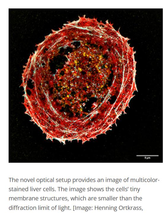 研究人员同时在杂志中展示了新型显微镜装置对固定的多色染色肝细胞进行的成像。图像显示了细胞的微小膜结构,这些结构小于光的衍射极限。