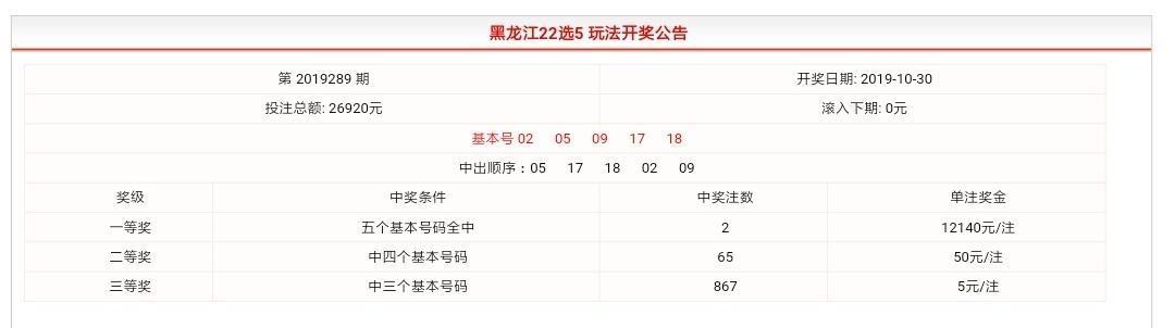 黑龙江福彩第2019289期22选5开奖号码: 02 05 09 17 18