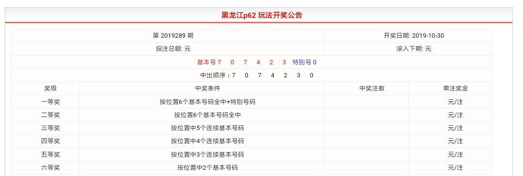 黑龙江福彩第2019289期p62开奖号码:7 0 7 4 2 3特别号 0
