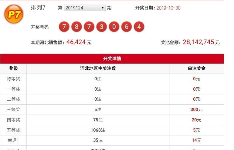 河北福利彩票第2019124期排列7开奖号码:7 8 7 3 0 6 4