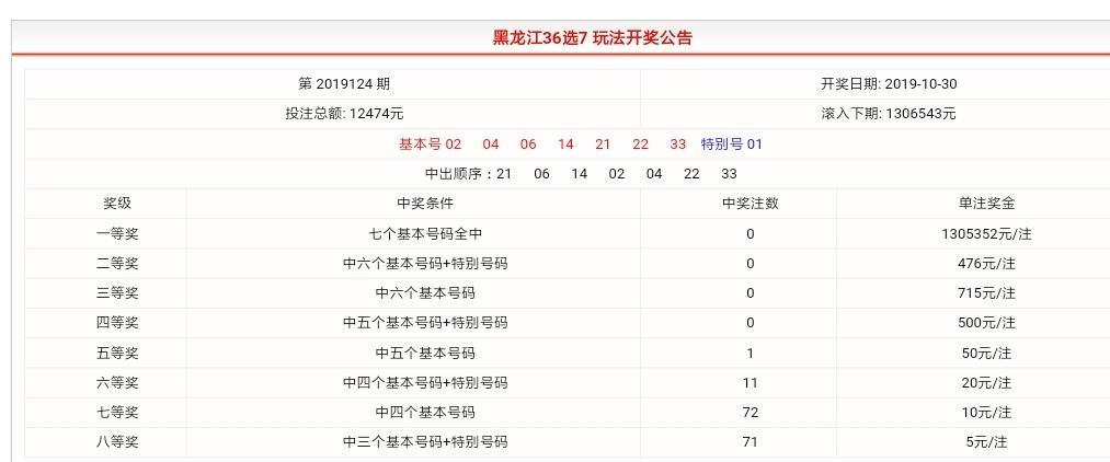 黑龙江福彩第2019124期36选7开奖号码: 02 04 06 14 21 22 23+01
