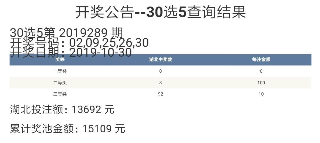 湖北福彩第2019289期30选5开奖号码: 02 09 25 26 30