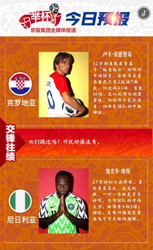 另外,除去这场焦点之争,还将有今晚还有法国vs澳大利亚(2018年6月16日18:00)。以及明天凌晨的秘鲁VS丹麦(2018年6月17日 00:00)、克罗地亚vs尼日利亚(2018年6月17日03:00)几场精彩对决即将上演,一起为世界杯狂欢吧!