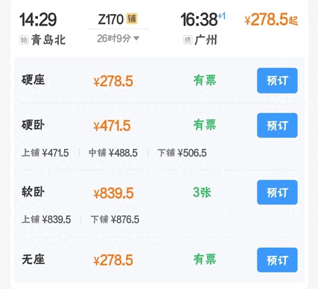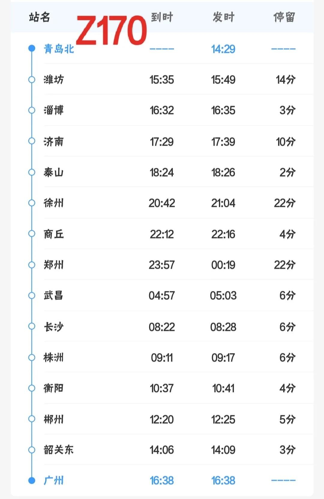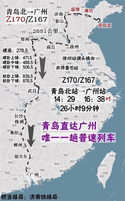 青岛直达广州唯一一趟火车:Z170次列车,26个小时,徐州调头换向