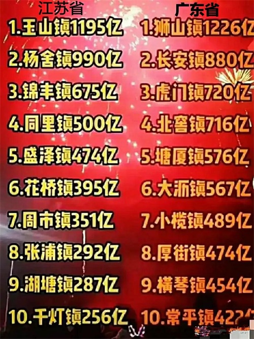 (GDP)超千亿元的超级大镇有4个,分别是全国经济第一名的江苏省苏州市代管的昆山市玉山镇,第二名是广东省佛山市南海区狮山镇,第三名是贵州省遵义市代管的仁怀市茅台镇,第四名是广东省佛山市顺德区北滘镇。可以说四个镇就是新时代的中国四大名镇,其经济实力强可敌市。