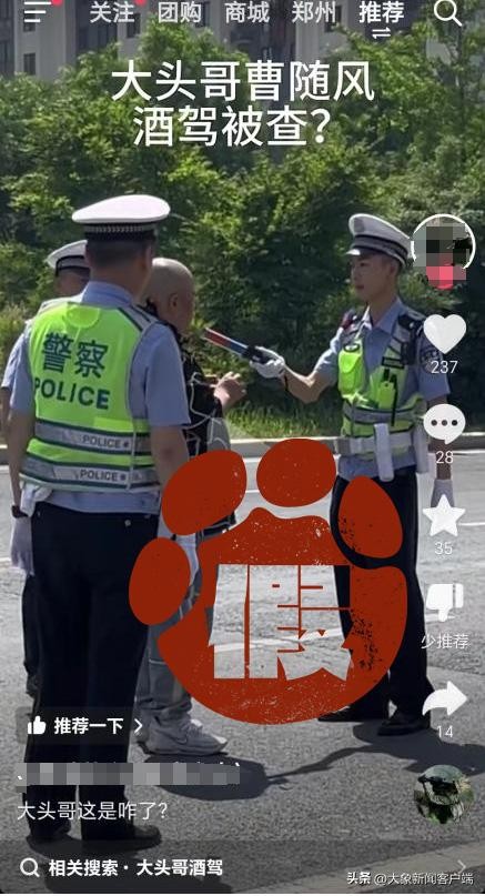 喝酒不开车,开车不喝酒,这句警示大家都耳熟能详。5月14日,有网友在某短视频平台发布视频称“大头哥曹随风酒驾被查?”这则视频也受到了不少网友的关注,并引来了众多评论。事情果真如此?对此大象新闻记者进行了求证。