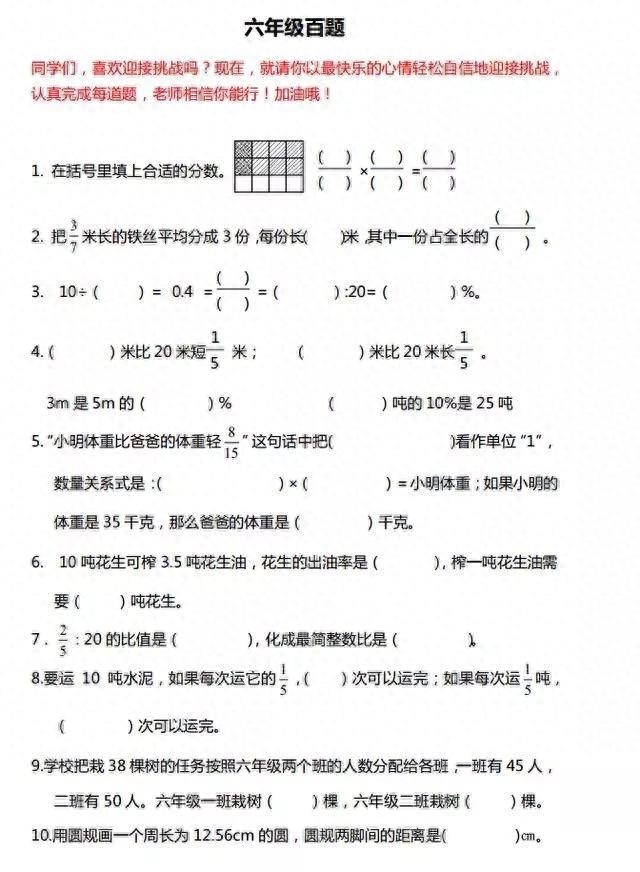 以下这份资料,是何老师精心为同学们整理的六年级常见的100道经典题目,让六年级的同学们能够高效地把握重难点。后面附上参考答案,让孩子快速得到反馈,及时查缺补漏,有需要的家长可以打印一份。