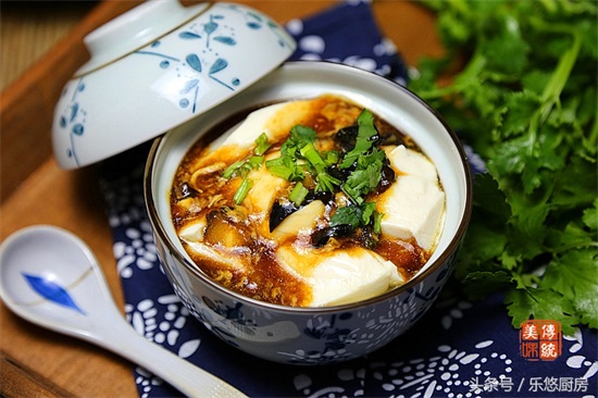 第十二步:先往碗中盛一些豆腐,然后浇上一些卤汁,再撒少许香菜末即可。(蒸好的豆腐碗中会有不少汤汁,要把这些汤汁都倒掉,否则会影响口感)