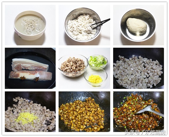 第五步:将煮好的五花肉晾凉,切成丁。葱切末,姜切末备用。