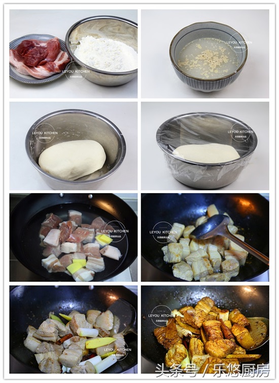 第五步:在醒发面团的时候,开始做腊汁肉。把肉切成块,放入冷水锅中,再放入10毫升料酒,几个姜片。大火烧开后煮2-3分钟,然后将肉块捞出。(肉皮可以留下,口感更好哦。)