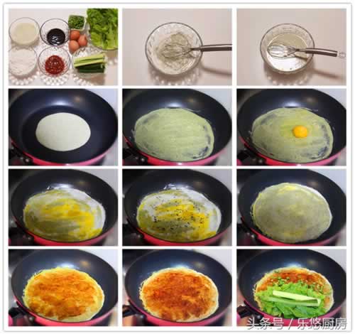 第十一步:继续烙制蛋液凝固,饼成熟时盛出。
