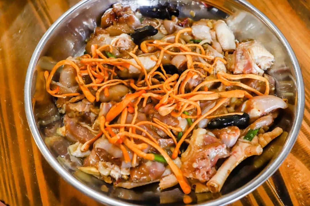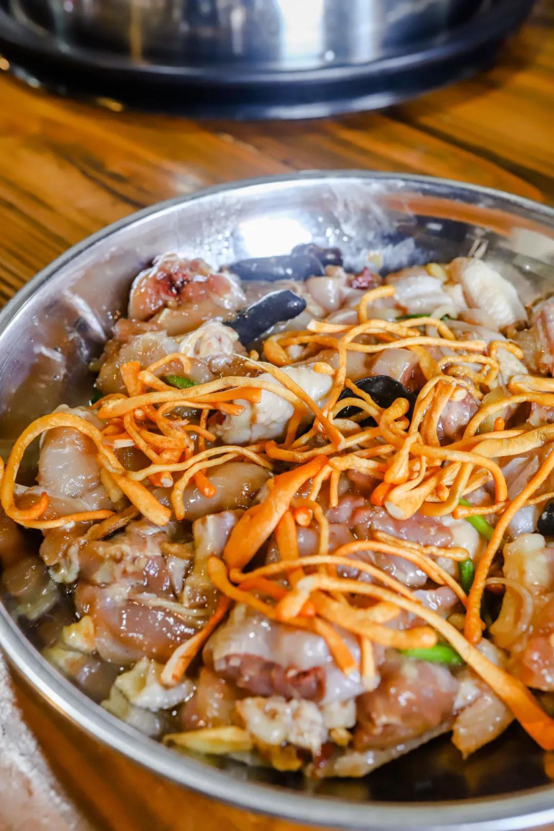 桑拿鸡推荐选择养足200天的大扇鸡,加上木耳、满满的虫草花提鲜,一起清蒸,鸡肉会带上淡淡的清香。