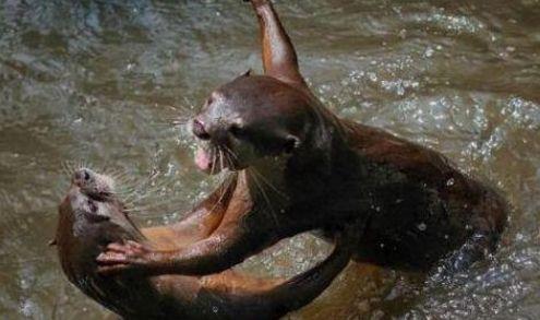 别看水獭看起来很憨,其捕捉食物的时候也有一手,特别是捕捉停留在水面上的鸟。当它们发现有鸟儿停留,便偷偷潜伏到其附近,待其不留意的之时,就从水下迅速冒出,大口咬住鸟类。
