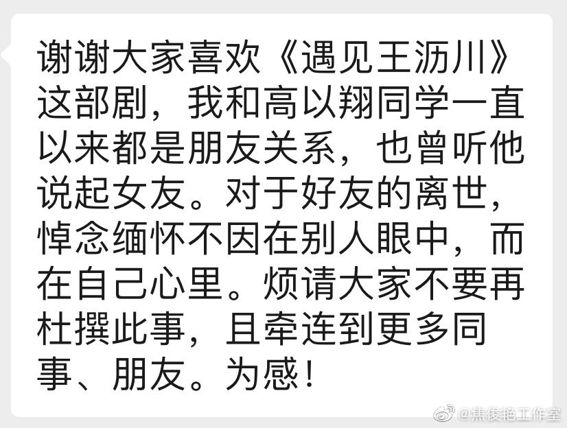 希望在高以翔离世后出现的诸如结婚了、冥婚、孩子等等这些不切实际毫无依据的造谣可以停止了,焦俊艳从头到尾的做法真的是我见过最得体的,所有的悼念缅怀源自对逝去朋友的真心,她不想牵连和伤害到身边的任何朋友。就让所有的美好就定格在小秋和沥川身上,不要再消费逝者,也还焦老师一份安宁吧!
