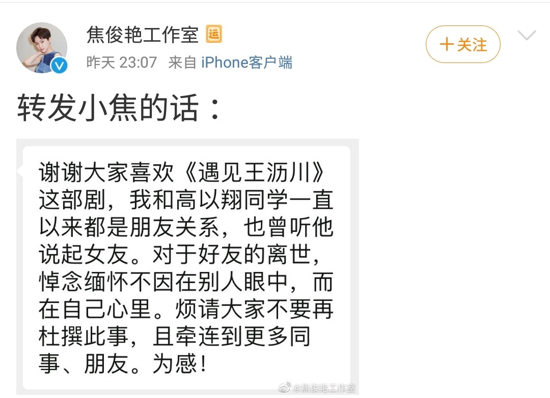 去世49天,焦俊艳发文回应和高以翔的关系,恳请网友不要再杜撰