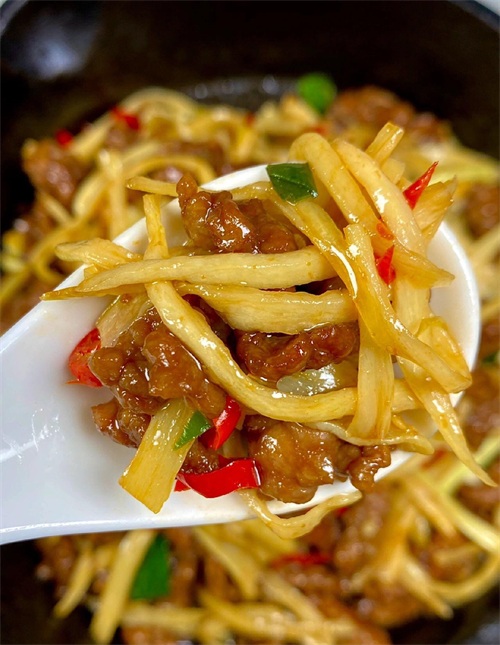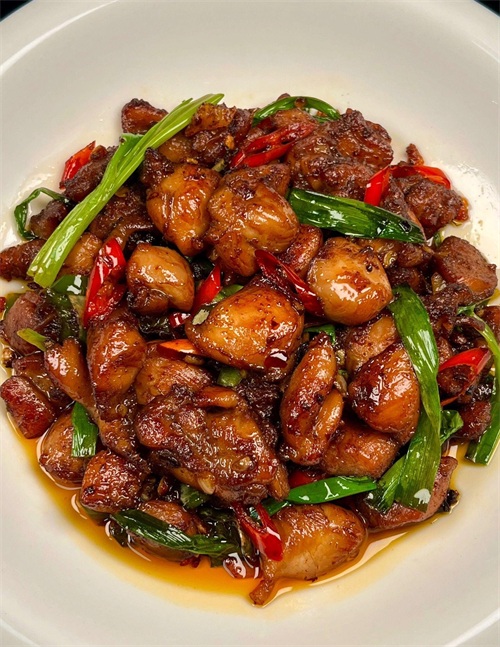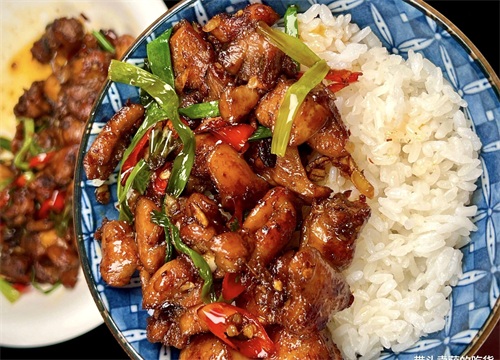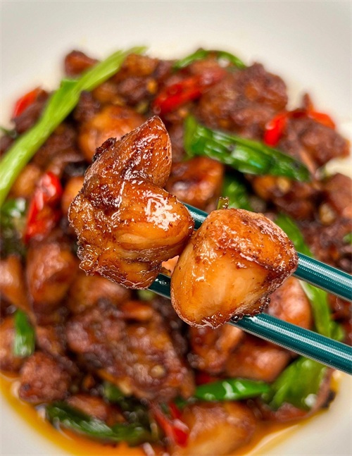 清香的茭白和嫩滑的牛肉相得益彰,简直是绝配!第二道是香辣鸡腿,