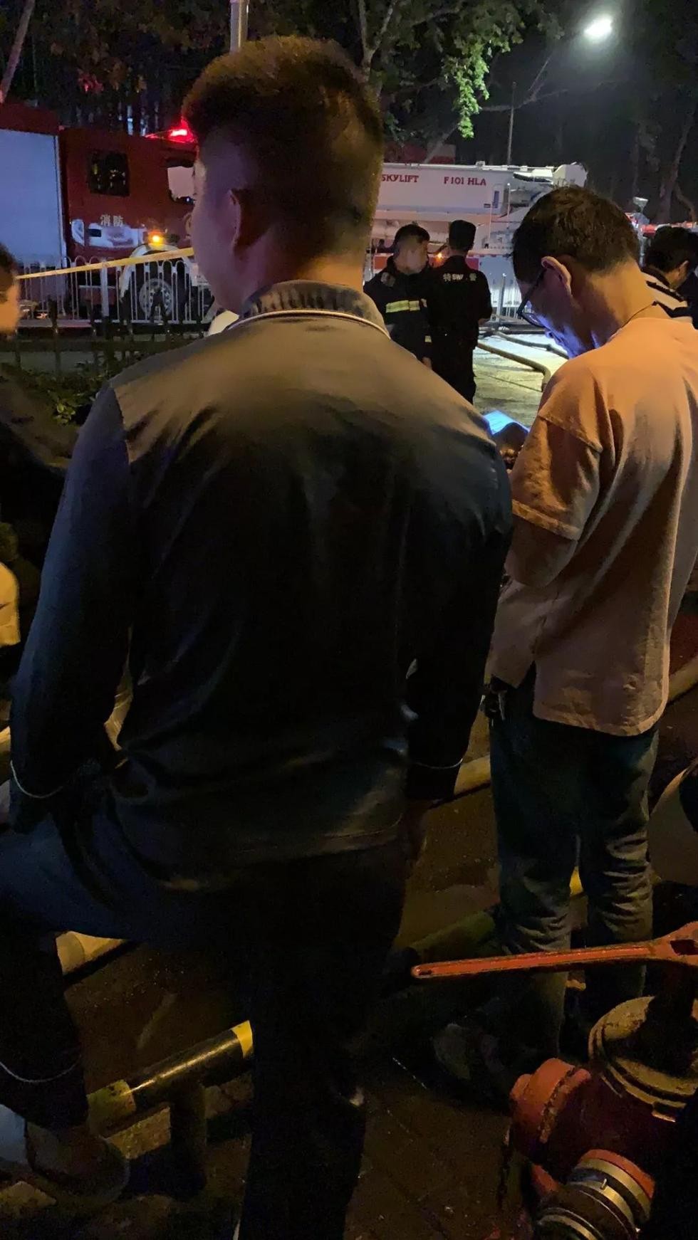 黄先生家住在德基后面,9点半看见微信群里说着火了,从家里看见冒烟就来现场看看。走到消防栓附近看见一个消防员拧消防栓很吃力便伸手帮忙。一帮就是一个多小时,截止11点,他还守候在消防栓边。钱先生、杨先生和黄先生均表示,准备等到现场工作基本结束再离开。